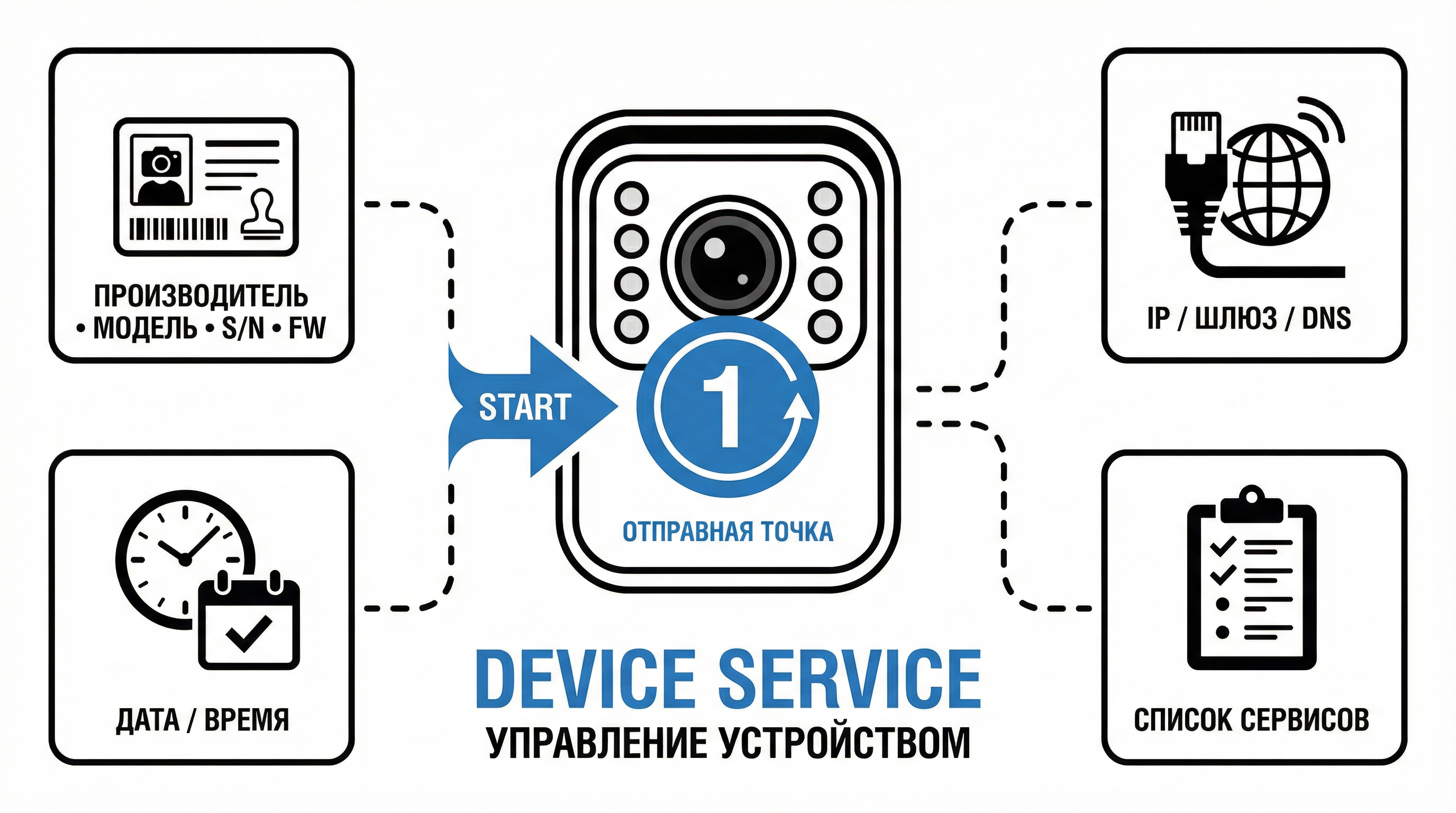 Этот сервис — отправная точка для любого взаимодействия с ONVIF-устройством. Он предоставляет базовую информацию о камере и позволяет управлять её конфигурацией.