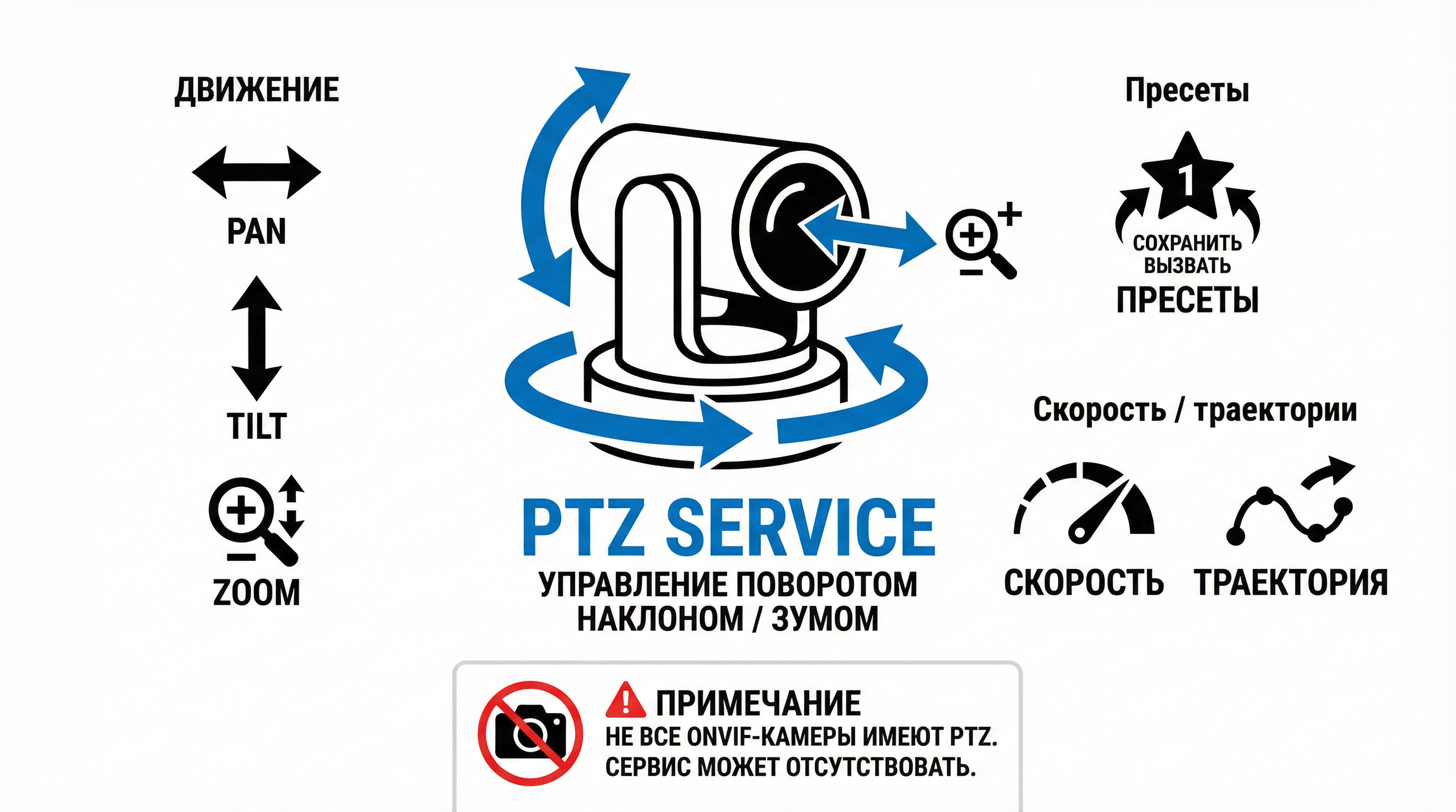 PTZ Service предназначен для управления камерами, способными физически изменять направление съёмки (Pan-Tilt-Zoom).