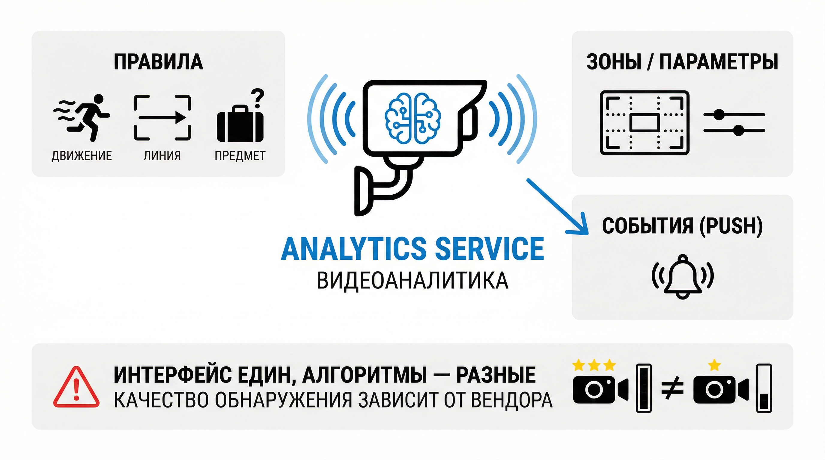 Analytics Service описывает возможности камеры по обработке видео и обнаружению событий на основе алгоритмов анализа изображения.