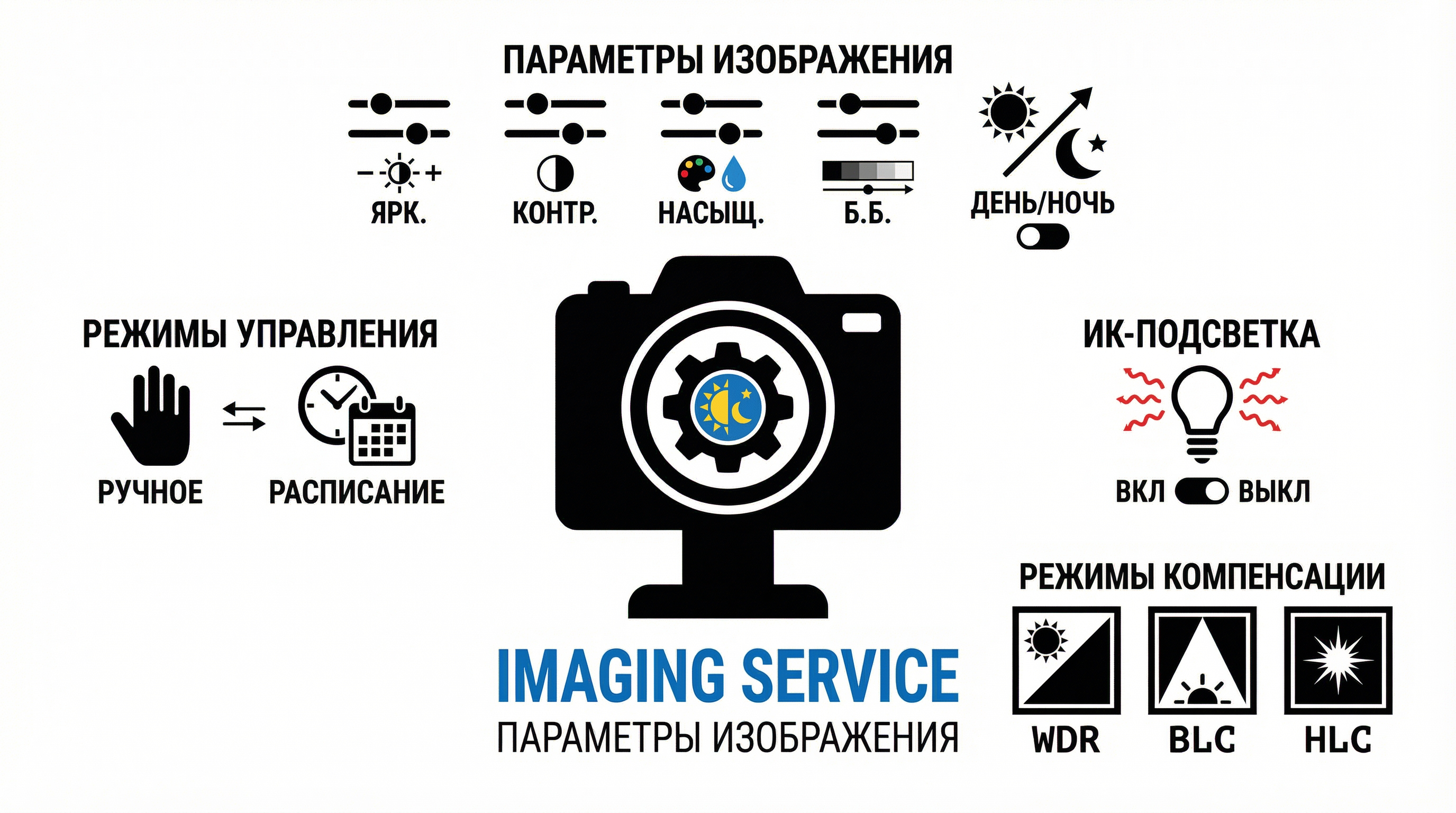 Imaging Service позволяет настраивать параметры изображения, такие как яркость, контрастность, насыщенность, баланс белого и режим день/ночь.