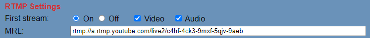 Теперь в веб-настройках камеры находим RTMP settings и в качестве ссылки вставляем stream URL, а затем через “/” ключ, который является идентификатором стрима. После перезагрузки (reboot) камеры стрим должен начаться.